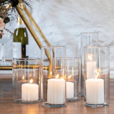 Unscented white pillar candles teamed clean and clear designer glass cylinders. Candles vary in from 7cm to 25cm in height and 5cm to 7cm diameter. Perfect on their own or combined with other candle combinations.